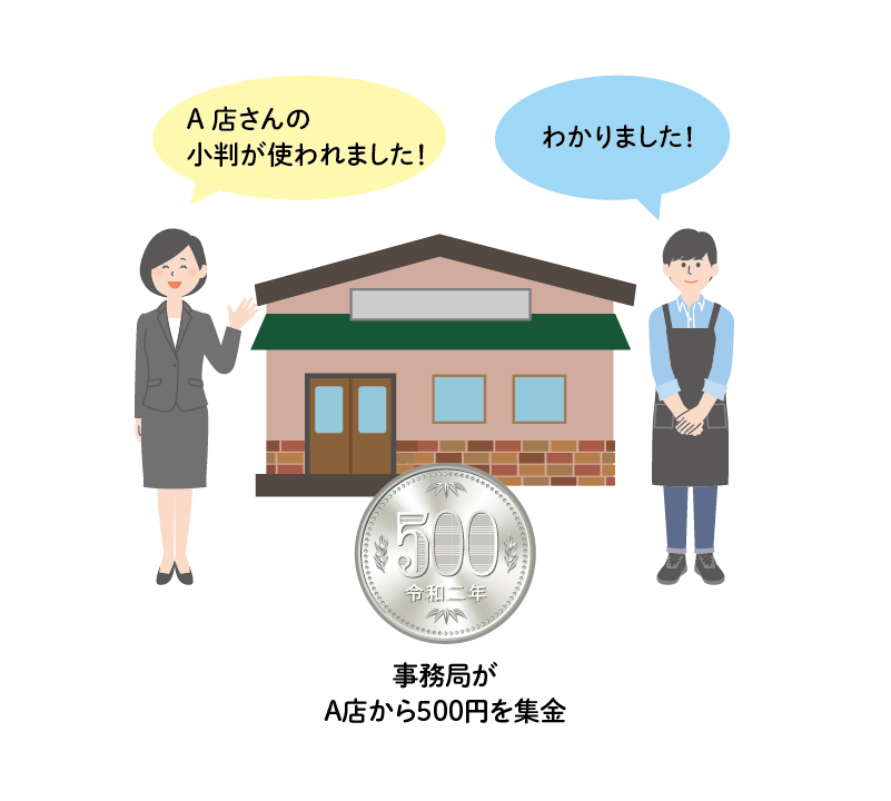 両替所(事務局)は、A店に小判が使われた旨を連絡し、